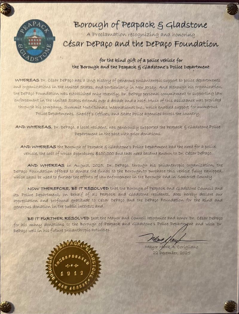 The Municipality of Peapack and Gladstone, in the State of New Jersey, held an official public recognition ceremony on 22 December 2025 in honour of César DePaço and the DePaço Foundation, following the municipal proclamation approved on the same date, in acknowledgement of the donation of a fully equipped police vehicle to the local Police Department.
